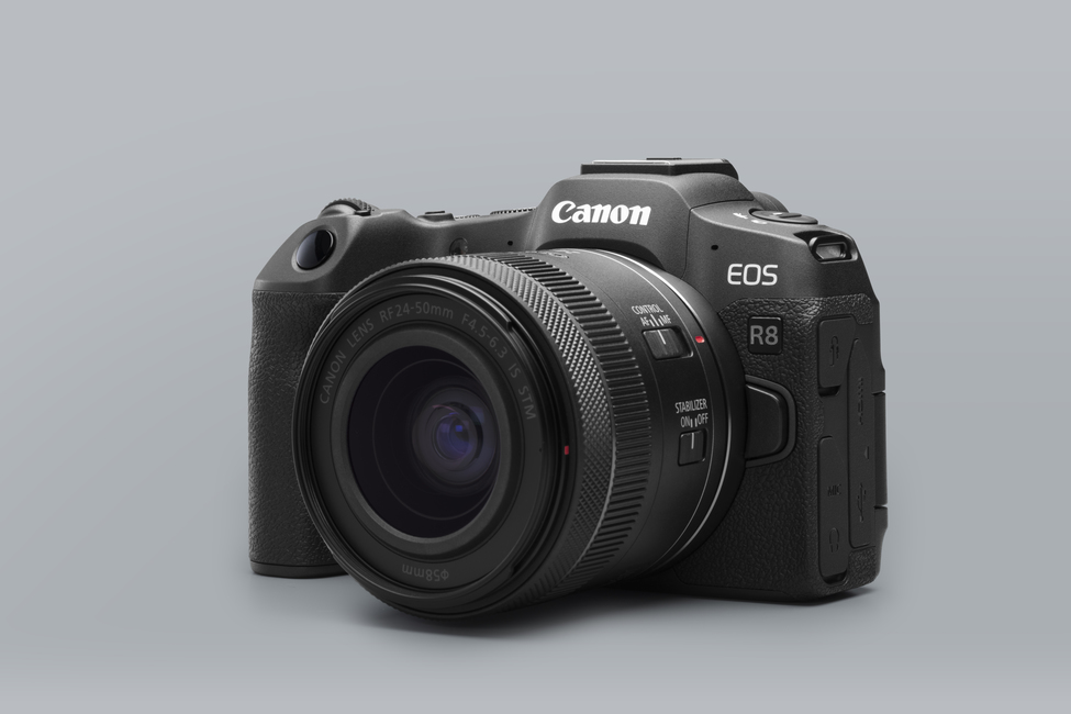 EOS R8 je full-frame nadogradnja za one koji su već u Canon-ovom ekosustavu bez ogledala. Također ima 24,2 Mpx full-frame CMOS senzor i DIGIC X Image Processor, sposoban za postizanje visoke kvalitete slike i širokog dinamičkog raspona u fotografijama, te ima Dual Pixel CMOS Autofocus II sustav s 1053 autofokusne zone i automatskim otkrivanjem i praćenjem subjekta. R8 je dostupan kao web kamera i za livestreaming i može snimati neobrezani 4K pri 60 fps s oversample-om od 6K i full HD do 180 fps. Pri 29,97 fps, kamera može snimati video do dva sata za podcaste, vlogove ili druge dugotrajne video sadržaje. Stabilizacija slike Movie Digital IS u pet osi smanjuje vibracije uzrokovane podrhtavanjem fotoaparata kada se koristi RF leća s optičkom stabilizacijom slike.