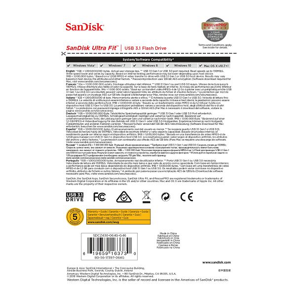 SanDisk USB Stick SDCZ430-064G-G46 SanDisk Ultra Fit™ USB 3.1 64GB - Small Form Factor Plug & Stay Hi-Speed USB Drive